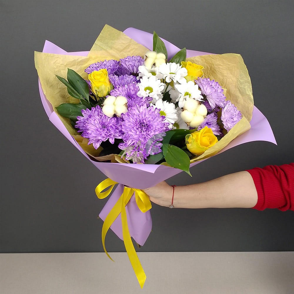 Состав и характеристики букета из роз и хризантем "Мозайка":
