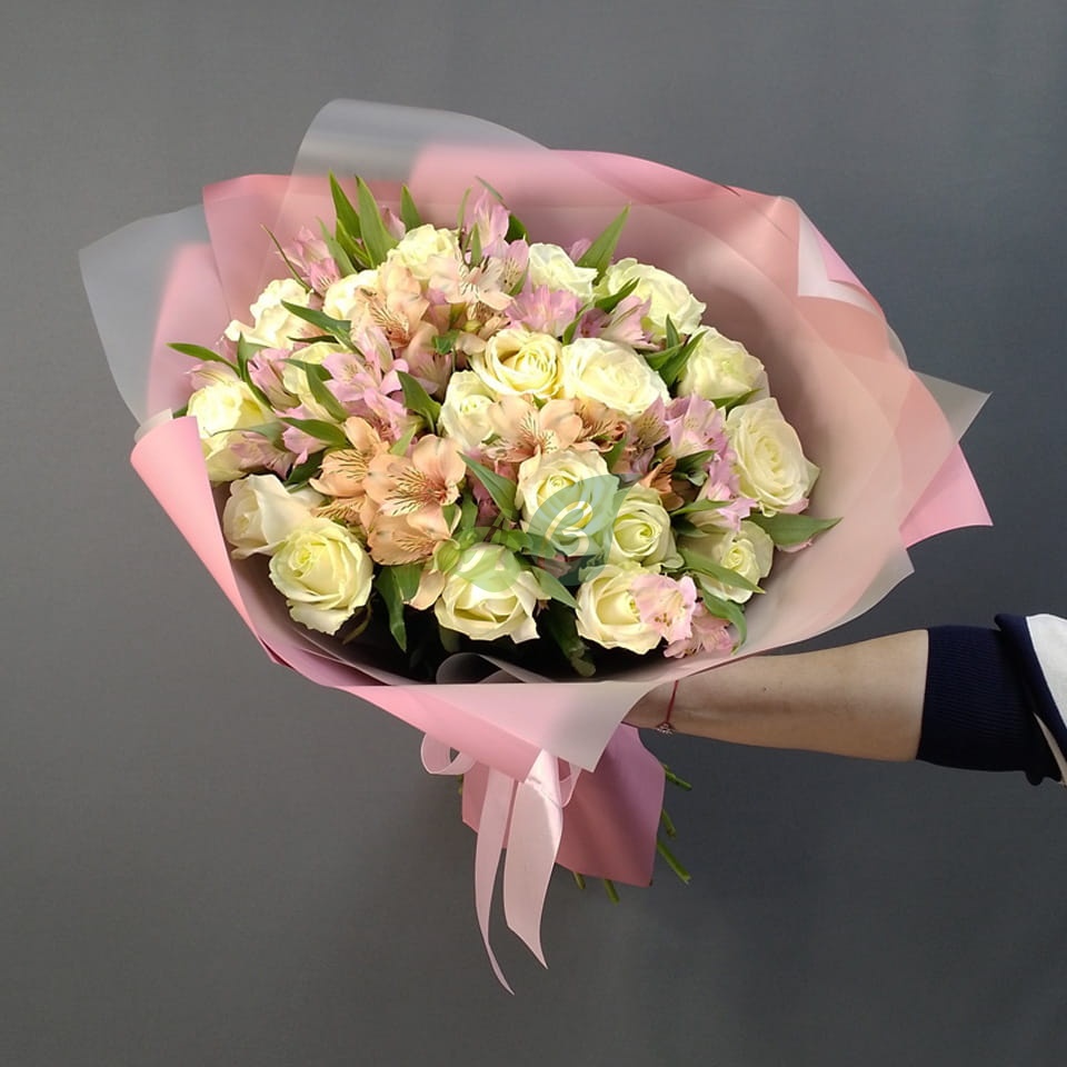 Изящный букет “Парижанка” – это свежие белые розы и розовые альстромерии в композиции на заказ с доставкой. Благодаря объемности роз и альстромерии этот букет нельзя назвать маленьким.